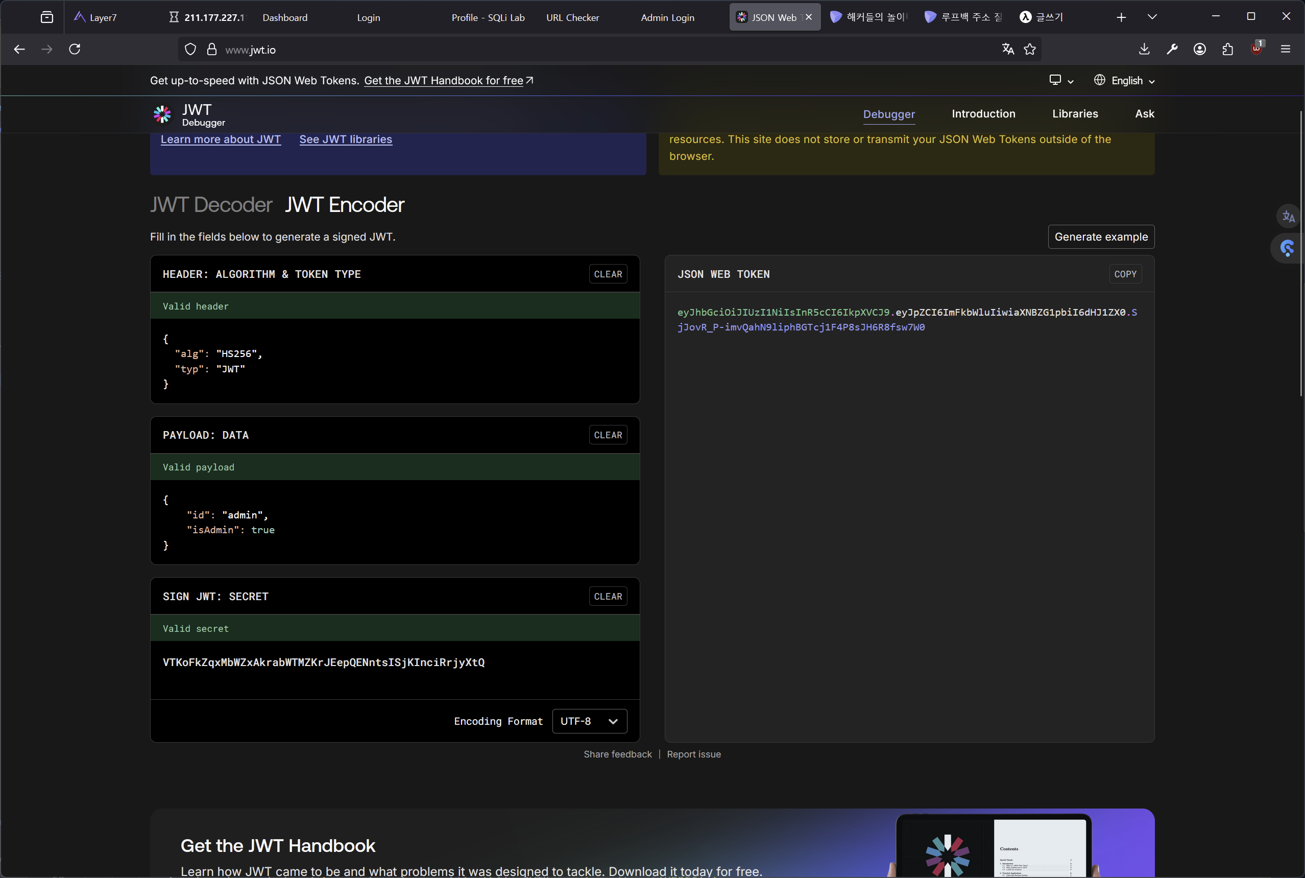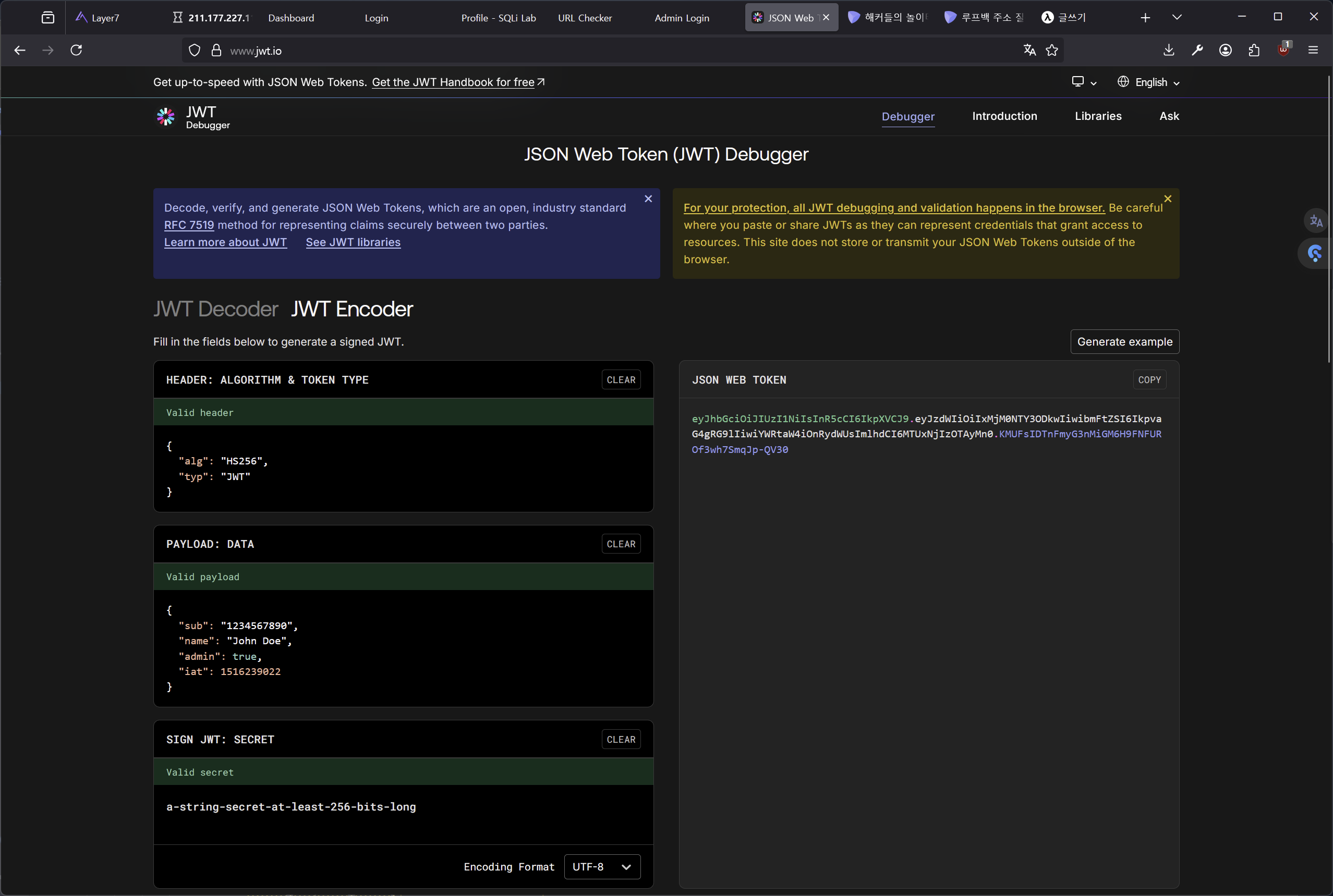 이 사이트를 사용하여 값을 조작한 후, 키를 이용해 새로운 토큰을 만들 수 있다.