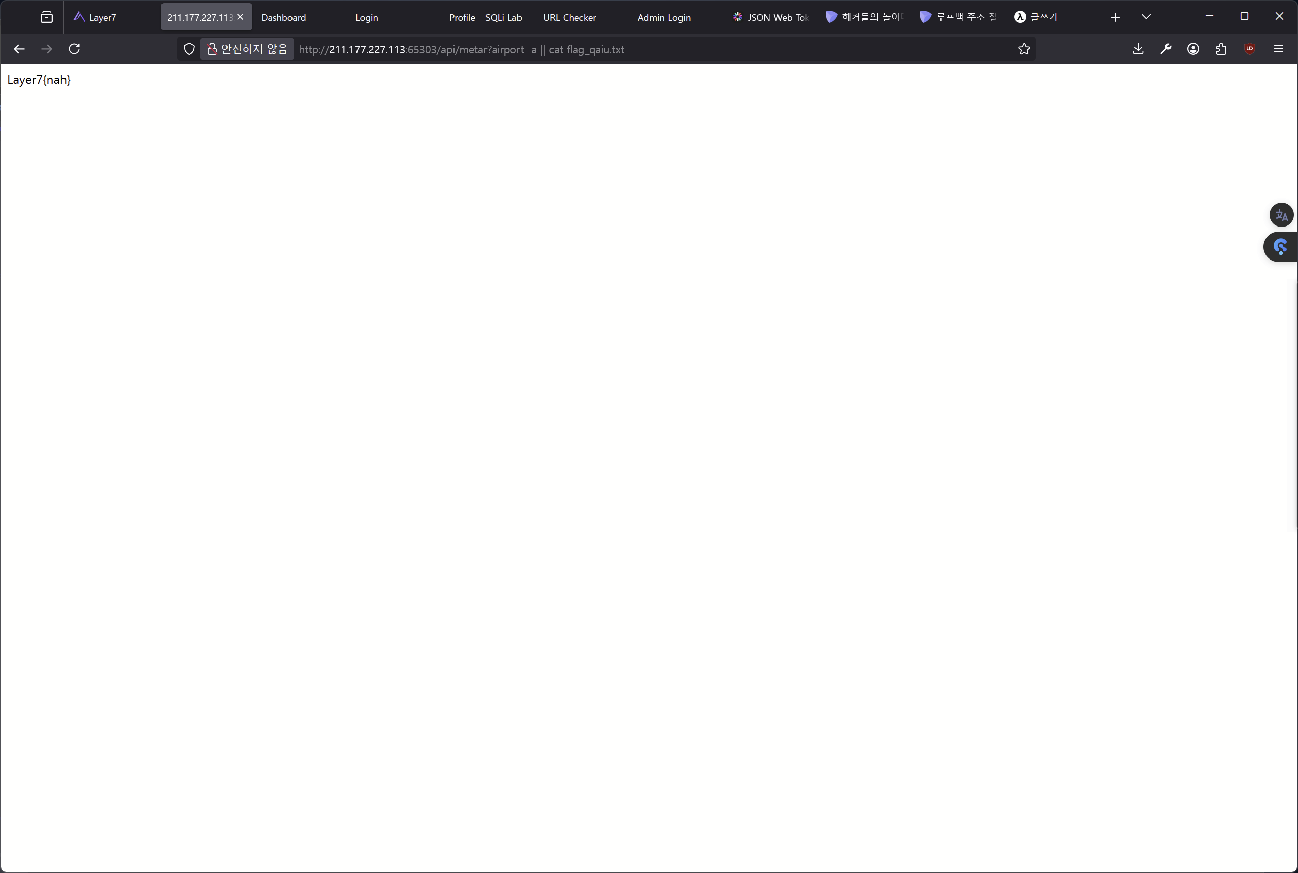 위 코드는 어드민이 확인되었을 때, airport 쿼리 값을 받아와서 curl 명령어를 실행하는 코드이다. 이 코드에는 subprocess 함수를 이용한 command injection 취약점이 존재한다. 이 취약점을 이용하여 명령어를 실행해 플래그 값을 얻어오면 된다.
